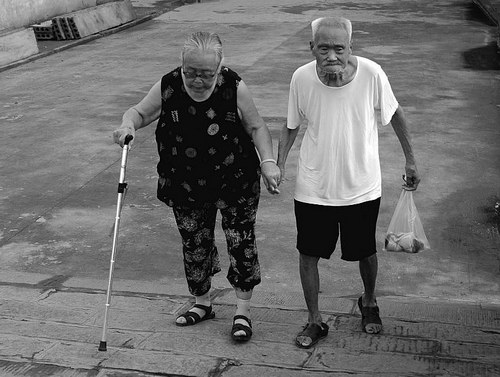 在小区市场附近等人,看见两个老人从我身边走过,两鬓已是白发苍苍,下弯的背脊记载着岁月留下的痕迹,俩人一左一右,步阀缓慢,表情却很从容。我凝视着他们,直到他们的身影渐渐地从我的视野消失,至始至终那两只苍老的手紧紧握着。